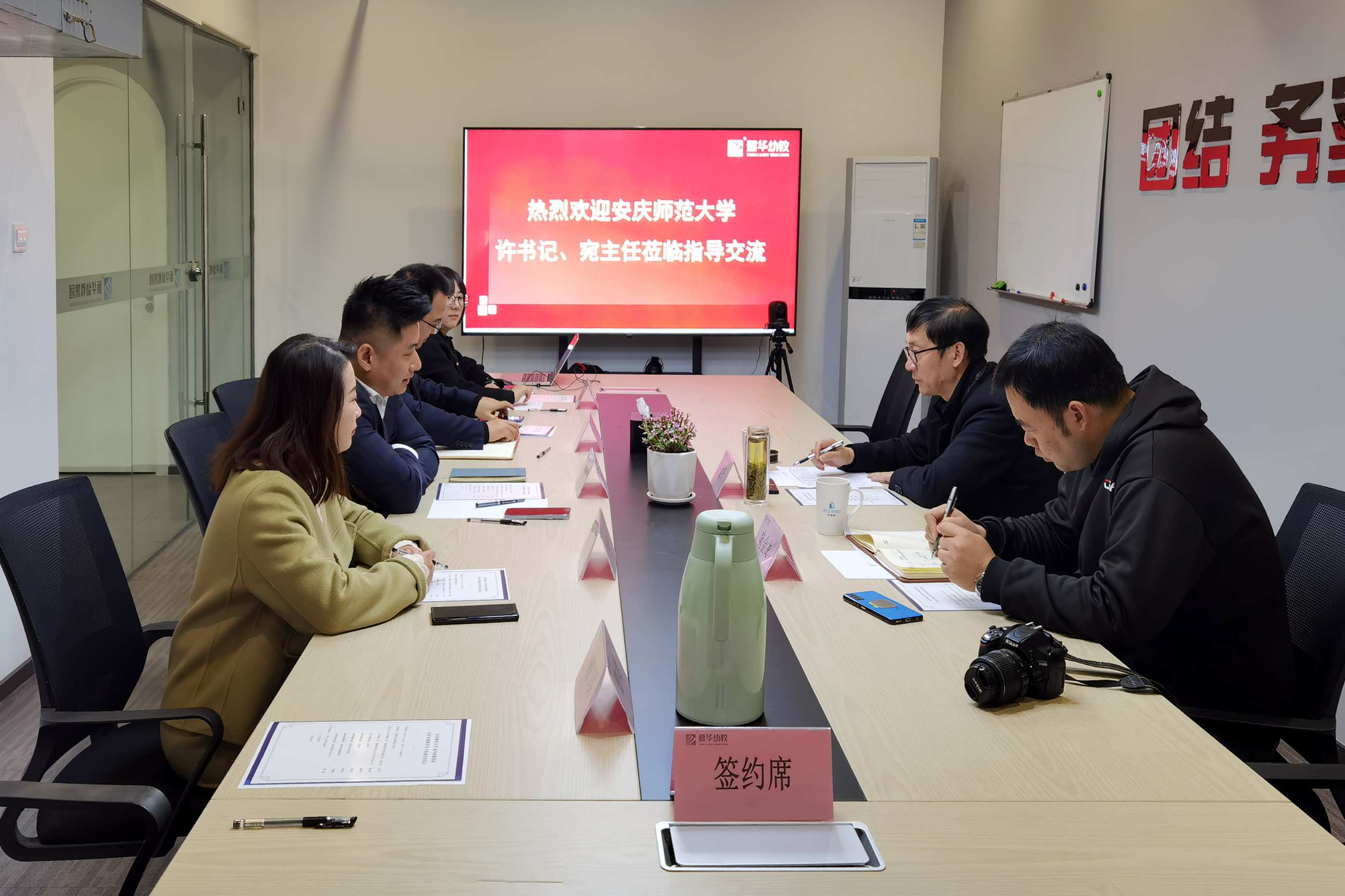 2021年11月26日,安庆师范大学教师教育学院党委副书记、纪委书记许世平以及教师教育中心实习实训办公室主任宛金龙莅临新华发展集团旗下新华幼教总部,开展了合作共建教育实习基地签约仪式。
