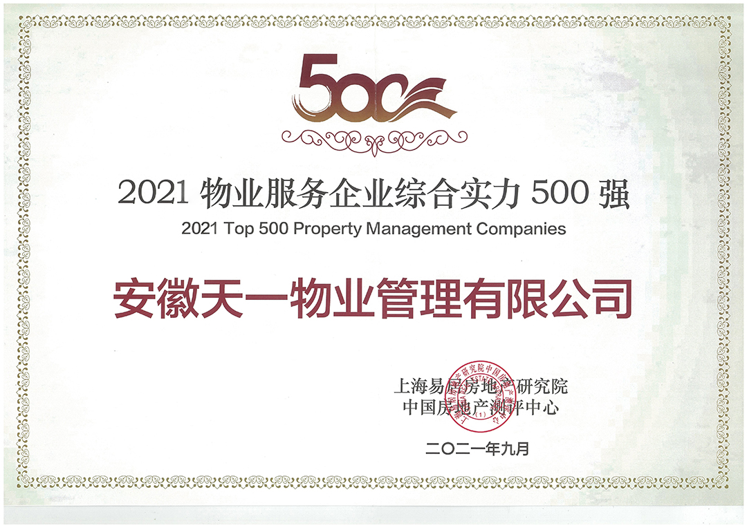 9月23日,2021物业服务企业综合实力研究成果发布会在成都隆重召开。会上,上海易居房地产研究院中国房地产测评中心发布了2021中国物业服务企业综合实力500强及相关榜单。安徽天一物业管理有限公司(以下简称新华天一服务)凭借运营规模、经营状况、盈利能力、成长潜力、服务质量、社会责任等多方面综合表现,荣获“2021年物业服务企业综合实力500强”称号。