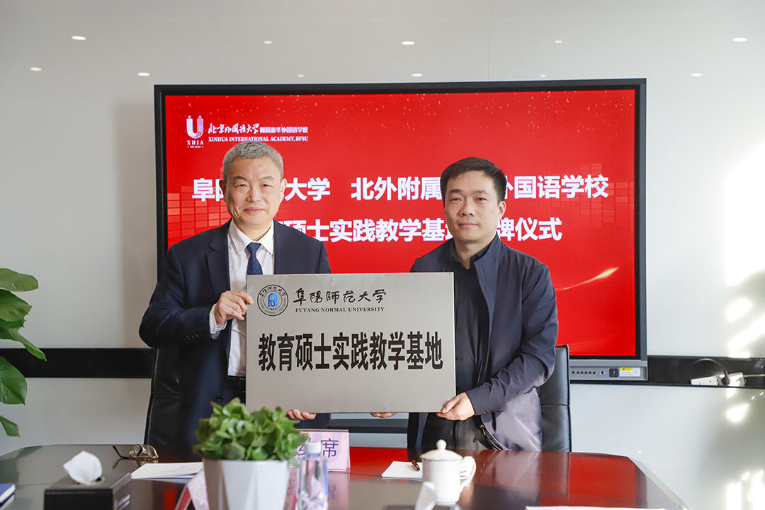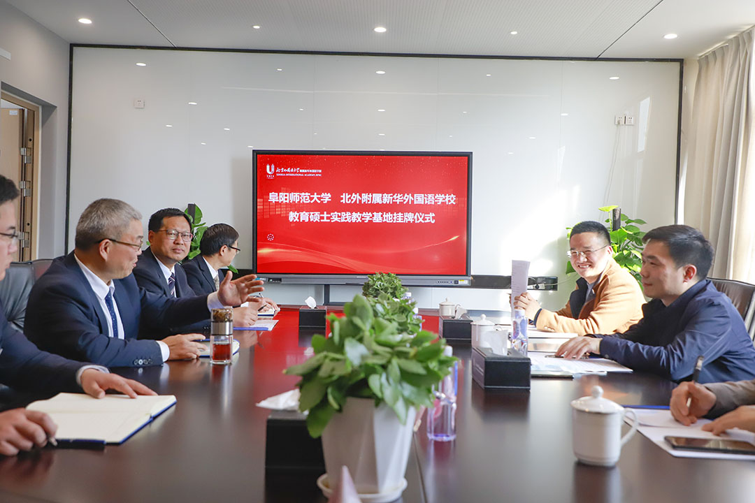 3月11日,阜阳师范大学教育硕士实践教学基地挂牌仪式在北外附属新华外国语学校举行。阜阳师范大学教育学院院长李欢,北外附属新华外国语学校总校长周慰、高中部校长李西军及相关部门负责人参加此次仪式。