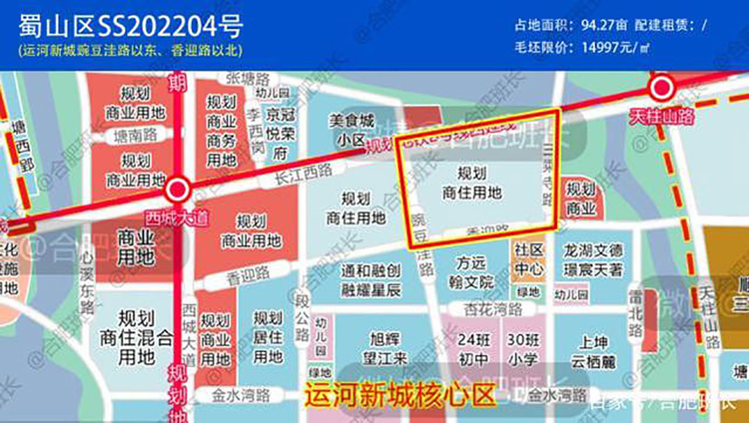 此次竞得的蜀山SS202204号地块属于运河新城核心区,位于蜀山区豌豆洼路以东、香迎路以北,土地面积为94.27亩,规划为商业、商务金融、住宅用地。